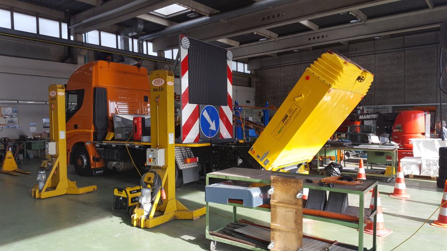 Nach einer Änderung der Sicherheitsvorschriften müssen kurzfristige Baustellen auf Nationalstrassen (Autobahnen) durch Anpralldämpfer - und LED-Vorwarntaflen geschützt werden. Diese Fahrzeuge schützen Tag und Nacht die aktiven Menschen vor Ort.