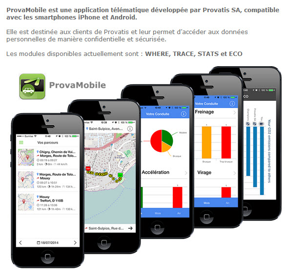 ProvaMobile est une application télématique développée par Provatis SA, compatible avec les smartphones iPhone et Android.